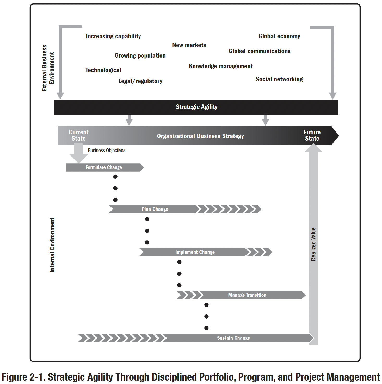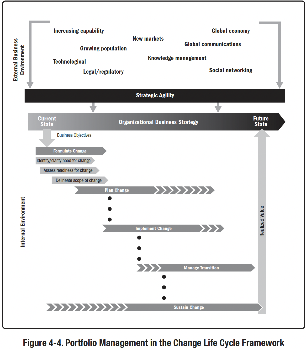 Стратегічна гнучкість визначається як здатність бізнесу проактивно використовувати зміни в бізнес-середовищі, демонструючи при цьому стійкість до непередбачуваних змін. Структура життєвого циклу змін, яка є частиною цієї схеми, описана в Розділі 2.4 і застосовується до управління портфелями, програмами та проектами в наступних розділах цього практичного посібника.