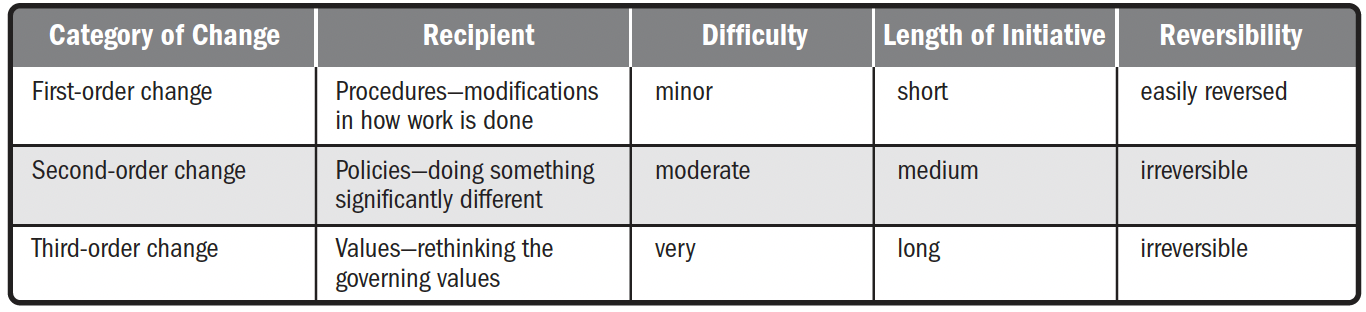 Зміни можуть стосуватися однієї сфери або всієї організації. Тим не менш, всі зміни, незалежно від того, походять вони з внутрішніх чи зовнішніх джерел, великі чи малі, передбачають прийняття нового мислення, процесів, політик, практик та поведінки.