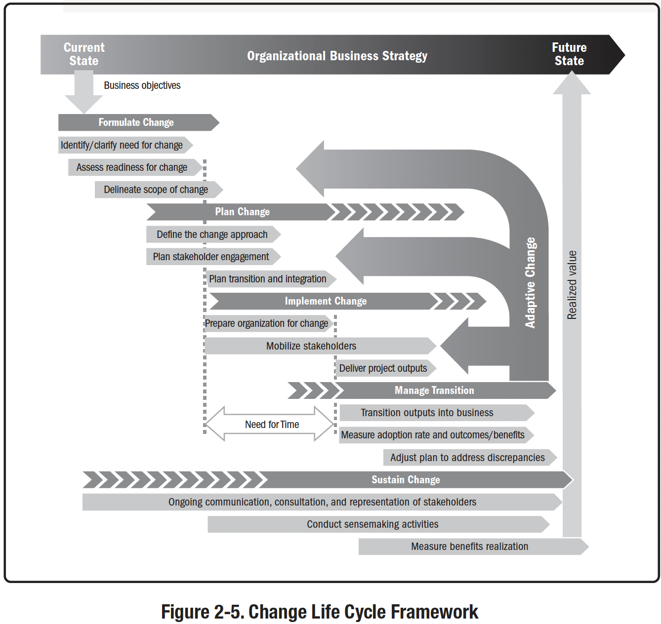 Керівники, фахівці-практики та зацікавлені сторони, які беруть участь у змінах, що відбуваються в результаті турбулентного та невизначеного бізнес-середовища, повинні мати чітке розуміння методології та гнучкості, пов'язаних зі змінами, притаманними бізнес-середовищу. Рисунок 2-1 представляє всеосяжну структуру змін.