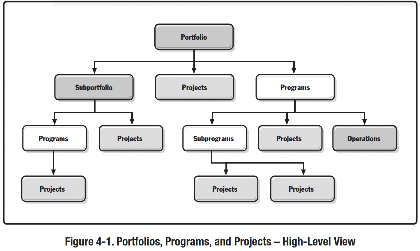 - Компоненти портфеля (Portfolio Components) - Як показано на Рисунку 4-1, портфель - це набір компонентів пов'язаних програм, проектів або операцій, якими керують як групою для досягнення стратегічних цілей. Портфель існує для досягнення однієї або декількох організаційних стратегій і цілей і може складатися з набору минулих, поточних і запланованих або майбутніх компонентів портфеля.
