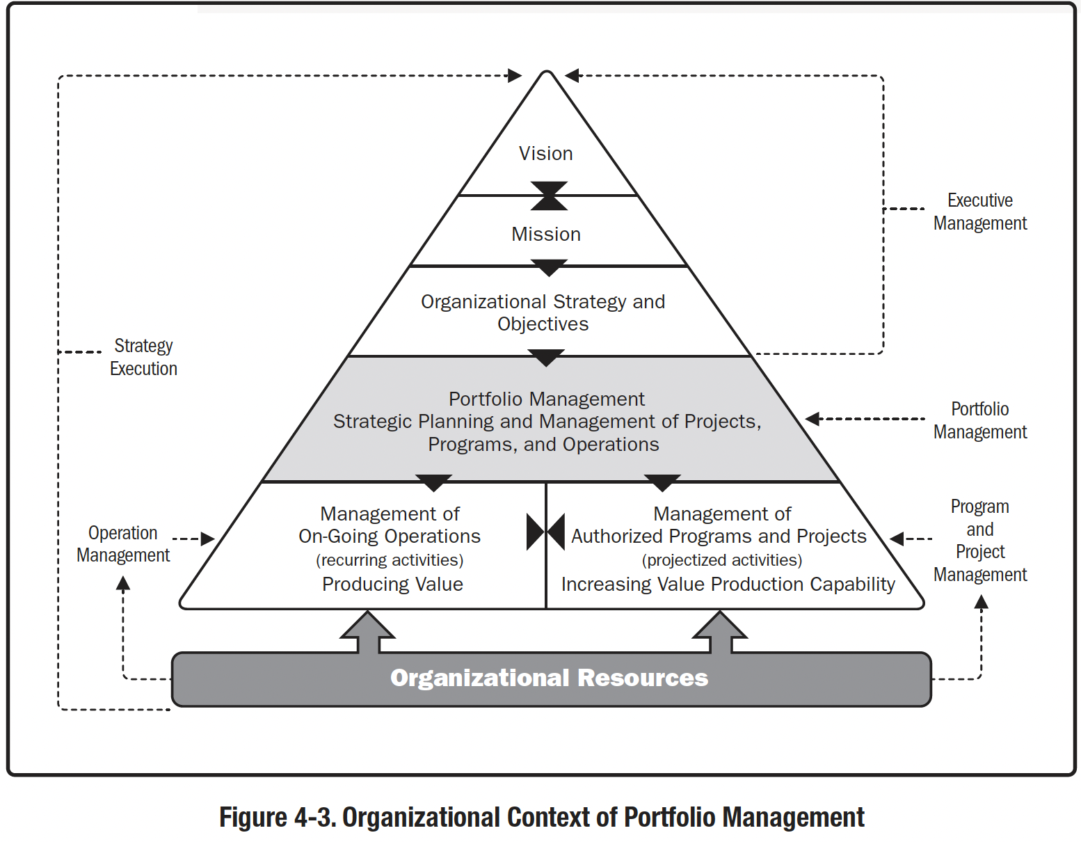 - Стратегічні ініціативи (Strategic Initiatives) - Організації реалізують свої стратегії шляхом створення стратегічних ініціатив, які складаються з портфелів програм і проектів, спрямованих на досягнення майбутнього стану. Компоненти портфеля не обов'язково можуть бути взаємозалежними або мати пов'язані цілі. Організація може мати більше одного портфеля, кожен з яких відповідає унікальним організаційним стратегіям і цілям. Запропоновані ініціативи структуруються як портфелі, а їх компоненти визначаються, оцінюються, відбираються та затверджуються. Управління необхідними змінами має бути невід'ємною частиною планування ініціатив.