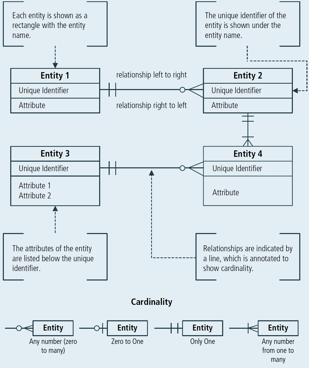 Зв'язки між сутностями забезпечують структуру моделі даних, зокрема, вказуючи, які сутності пов'язані з іншими сутностями і як саме. Специфікації зв'язку зазвичай вказують кількість мінімальних і максимальних входжень, дозволених на кожній стороні цього зв'язку (наприклад, кожен клієнт пов'язаний точно з одним торговим залом, тоді як торговий зал може бути пов'язаний з нулем, одним або багатьма клієнтами).
