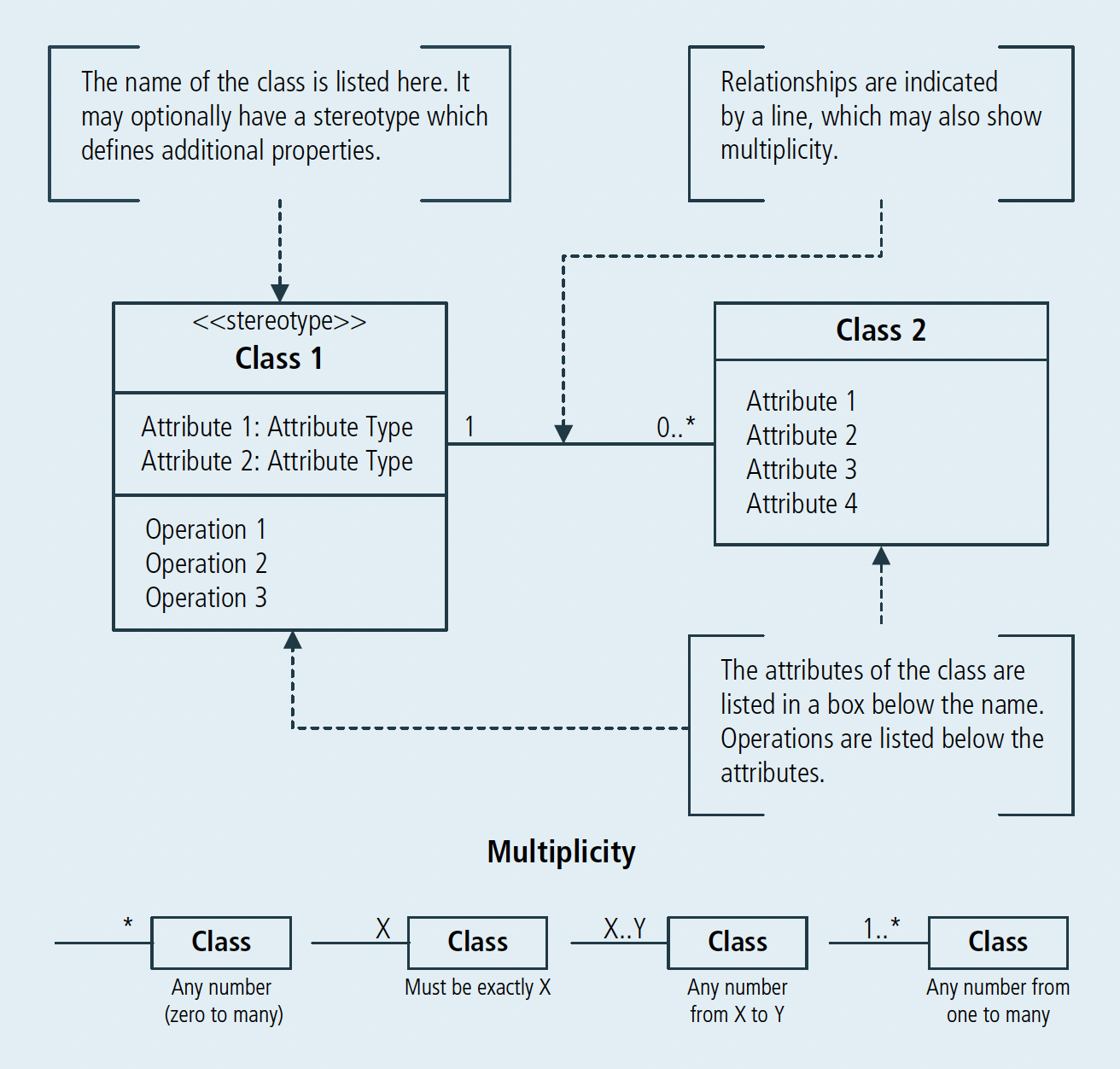 На діаграмі класів сутності називаються класами. Як і сутність у моделі даних, клас містить атрибути і має зв'язки з іншими класами. Клас також містить операції або функції, які описують, що можна зробити з класом, наприклад, створити інвойс або відкрити банківський рахунок.