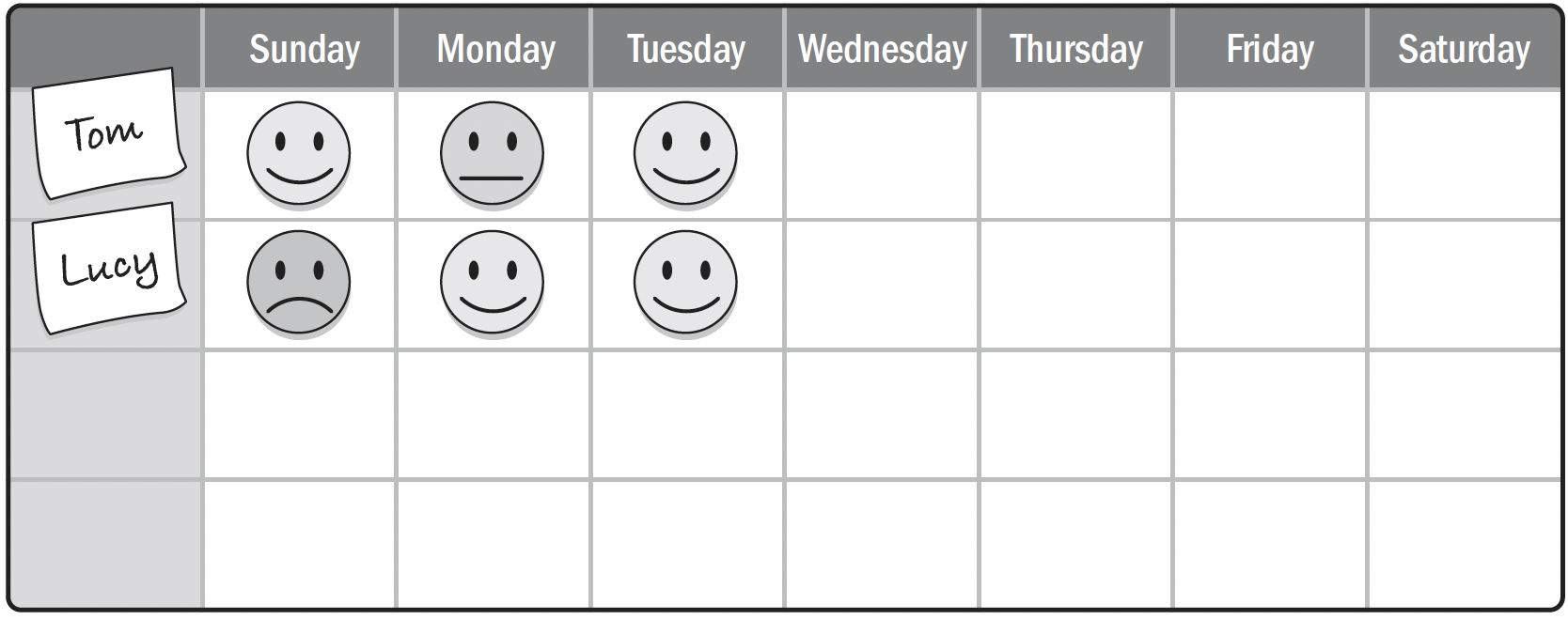 - Графік настрою (Mood chart). За допомогою діаграми настрою можна відстежувати настрій або реакцію групи дуже важливих зацікавлених сторін - команди проєкту. Наприкінці кожного дня члени команди проекту можуть використовувати кольори, цифри або смайлики, щоб показати свій настрій. На Рисунку 2-25 показано діаграму настрою за допомогою смайликів. Відстеження настрою команди проекту або окремих членів команди може допомогти виявити потенційні проблеми та сфери для покращення.