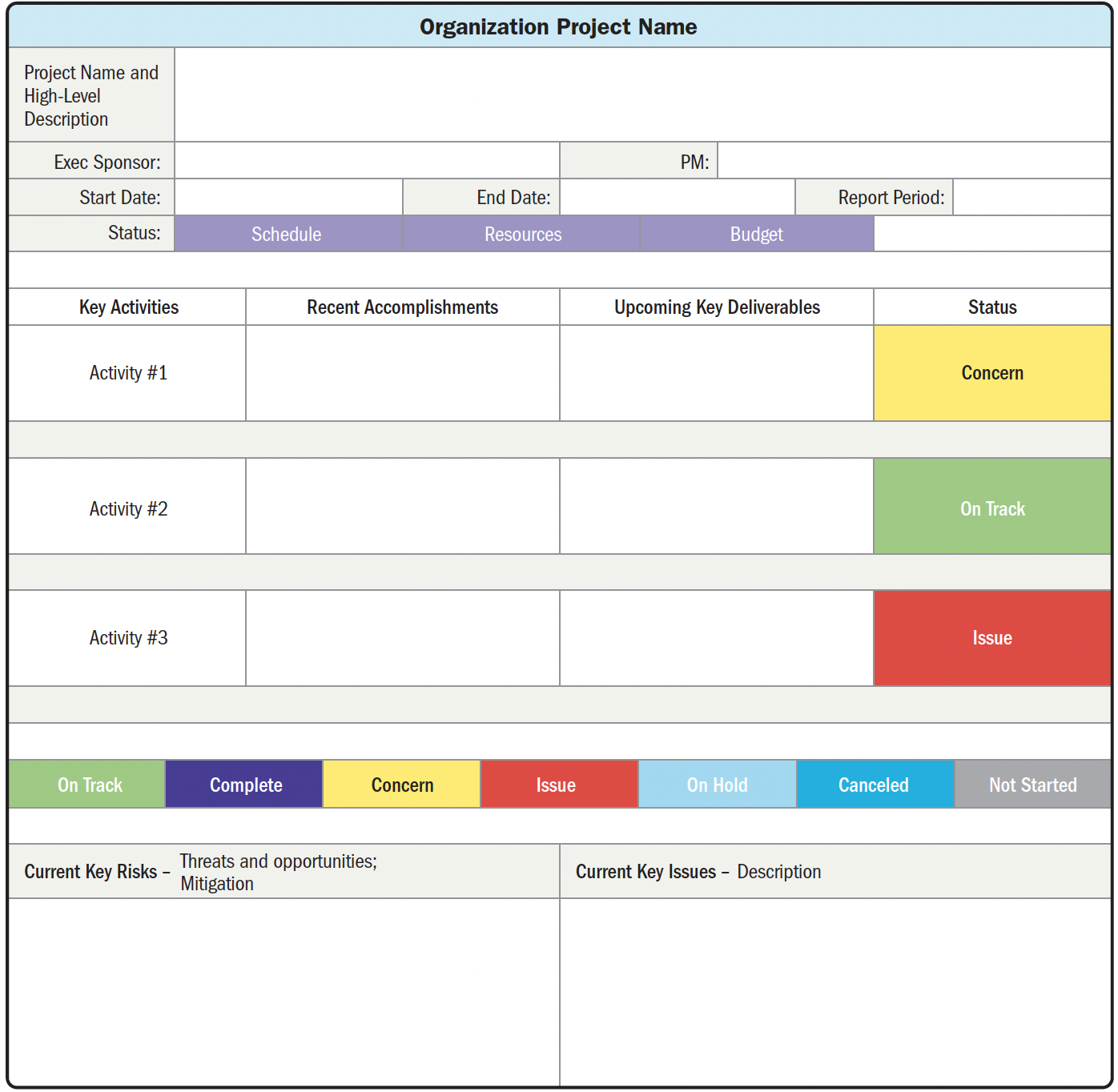 BVCs повинні бути легкими для оновлення, і їх слід часто оновлювати. Вони часто є "низькотехнологічними і високоінтуїтивними", оскільки підтримуються вручну, а не створюються в електронному вигляді. На Рисунку 2-28 показано інформаційний радіатор, пов'язаний із завершеною роботою, роботою, що залишилася, і ризиками.