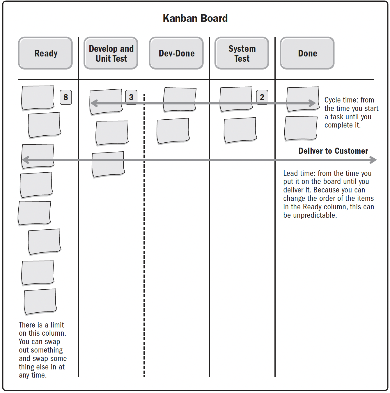 - Незавершене виробництво (Work in progress). Цей показник вказує на кількість робочих елементів, над якими ведеться робота в будь-який момент часу. Він використовується для того, щоб допомогти команді проекту обмежити кількість незавершених робіт до керованого розміру.