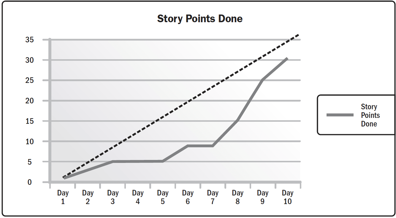 - Діаграми згоряння (Burn charts). Діаграми згоряння, такі як діаграми вигоряння або згоряння, можуть показувати швидкість роботи проектної команди. Швидкість вимірює рівень продуктивності, з яким результати створюються, перевіряються і приймаються протягом заздалегідь визначеного інтервалу. Діаграма "згоряння" може відстежувати обсяг виконаної роботи порівняно з очікуваним обсягом роботи, який має бути виконаний (див. Мал. 2-30). Діаграма згоряння може показувати кількість сюжетних точок, що залишилися, або кількість ризиків, які вдалося зменшити.
