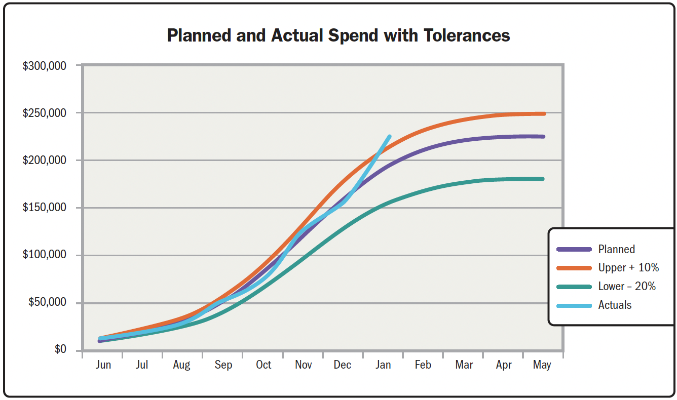 На Рисунку 2-31 показано приклад бюджетного порогу, встановленого на рівні +10% (помаранчевий колір) і -20% (зелений колір) від прогнозованого рівня витрат. Синя лінія відстежує фактичні витрати, і в січні вони перевищили верхній допуск +10%, що призвело б до запуску плану винятків.