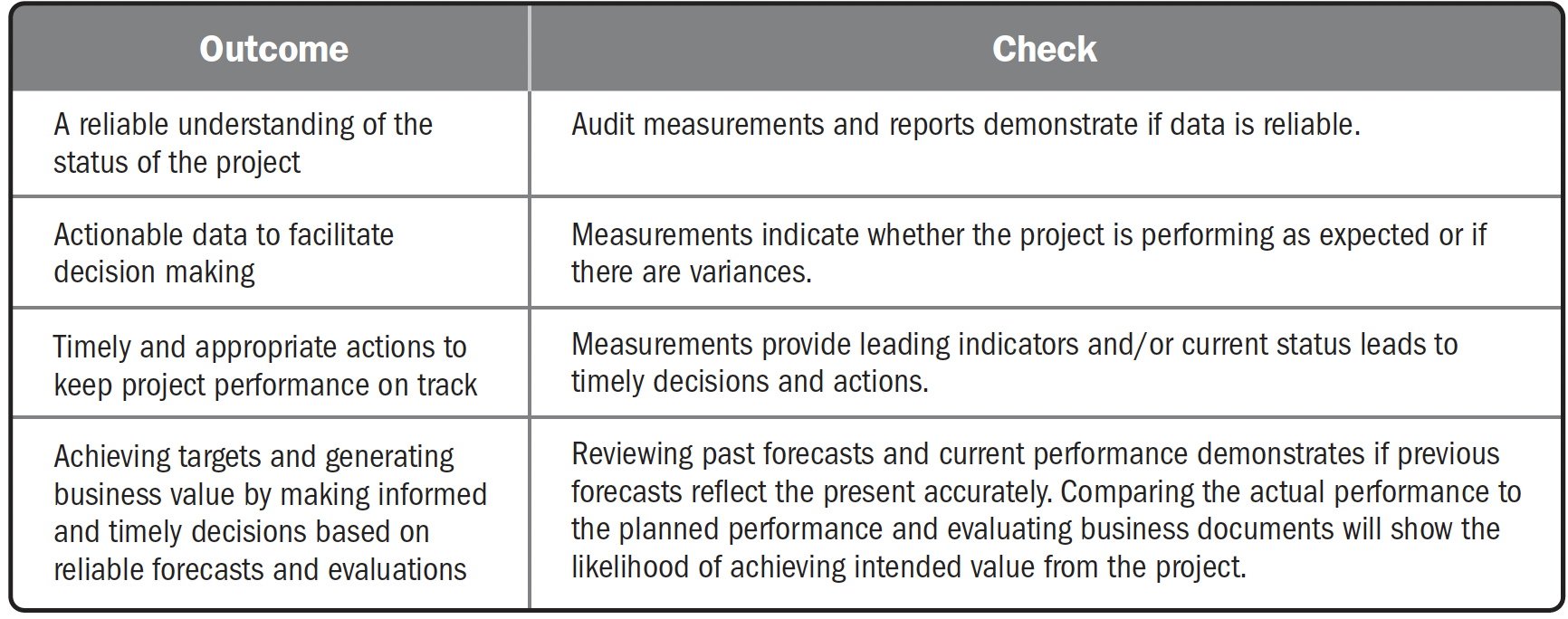 - Заплановані вигоди порівняно з фактичними вигодами (Planned benefits delivery compared to actual benefits delivery). В рамках бізнес-обґрунтування організації можуть визначити цінність як вигоду, яка буде отримана в результаті виконання проекту. Для проектів, які передбачають отримання вигод протягом життєвого циклу проекту, вимірювання отриманих вигод і цінності цих вигод, а потім порівняння цієї інформації з економічним обґрунтуванням, дає інформацію, яка може обґрунтувати продовження проекту або, в деяких випадках, скасування проекту.