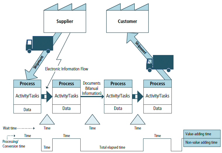 На кожному етапі карта потоку створення цінності вимірює час очікування вхідних ресурсів і фактичний час обробки в точках застосування (також відомий як час перетворення). В кінці ланцюга поставок карта потоку цінності відображає процес логістики або дистрибуції для клієнта.