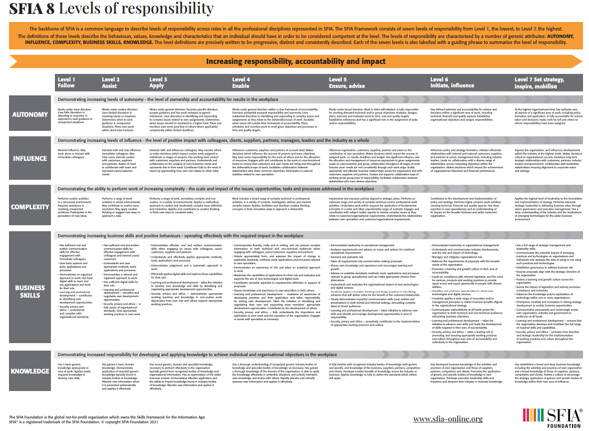 Сім рівнів відповідальності SFIA (описані нижче) характеризуються загальними атрибутами