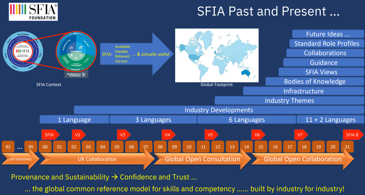 SFIA залишається результатом співпраці - він оновлюється в процесі відкритих глобальних консультацій і створюється для індустрії самою індустрією - зараз просто неможливо перерахувати всі організації, окремих осіб і країни, які внесли свій вклад у зміст SFIA, що робить його справді глобально прийнятною спільною мовою для навичок і компетенцій для цифрового світу.